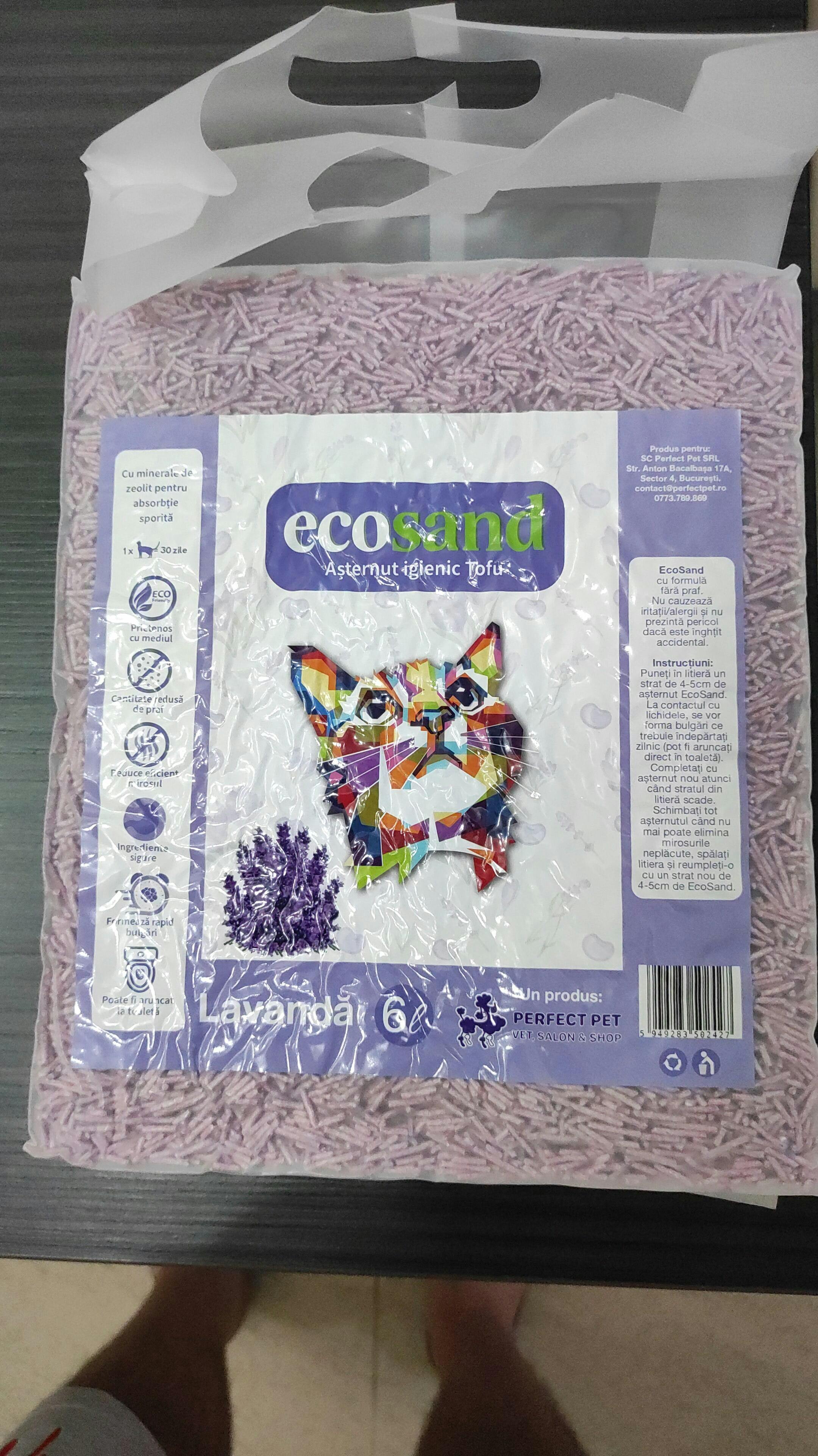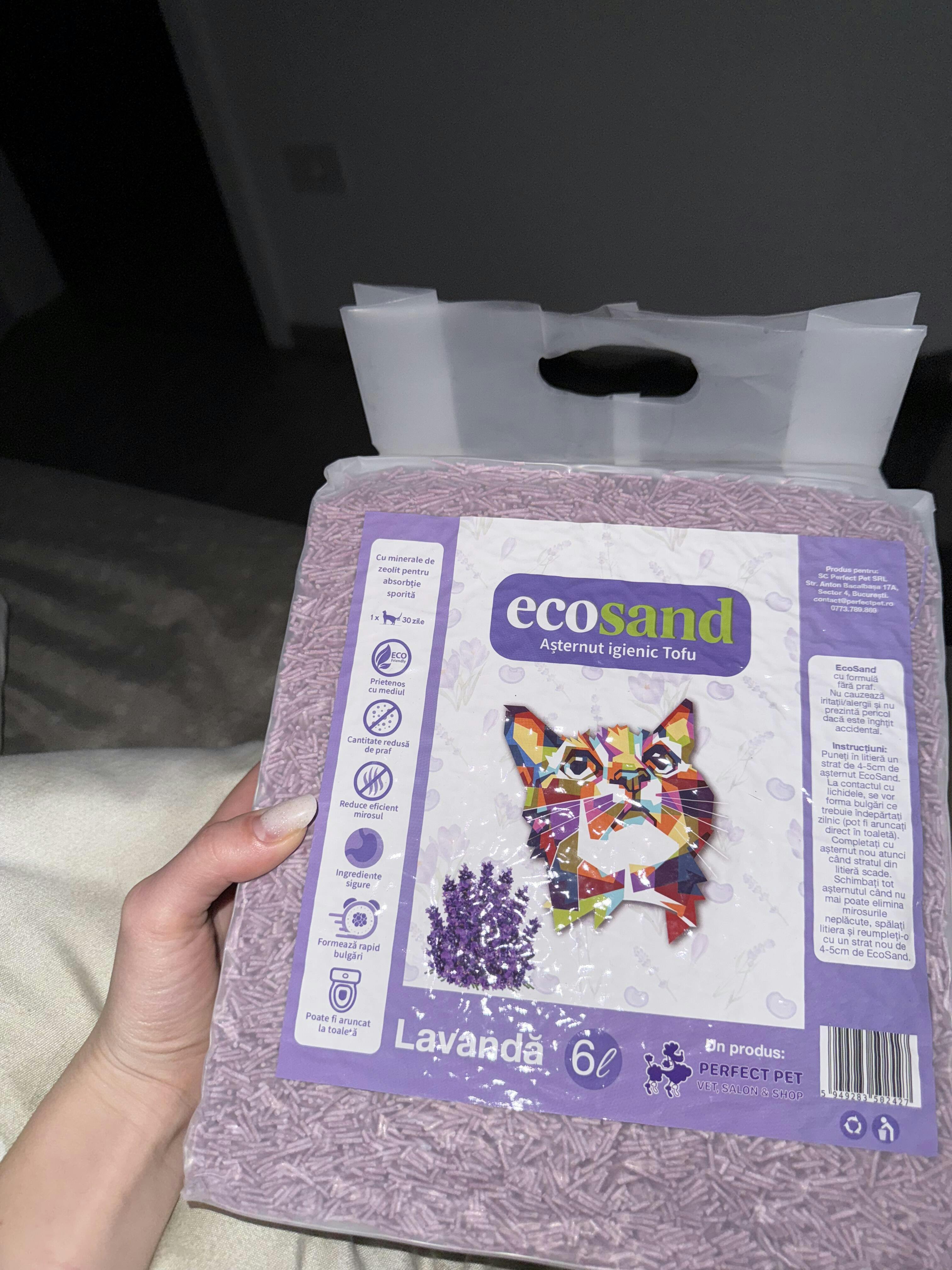 Bună ziua tuturor! Am început să folosesc acest nisipEcosand, auzind la vecina mea care are și ea 2 pisoi și mereu îl laudă. Zis și cumpărat😊, este forte eficient, adică în primul rând pisicile nu mai fac mizerie, miroase fff frumos (eu am cumpărat cu miros de levănțică) și se curăță foarte repede. Din prima clipă l a folosit pisicuțele. Mulțumesc Ecosand.